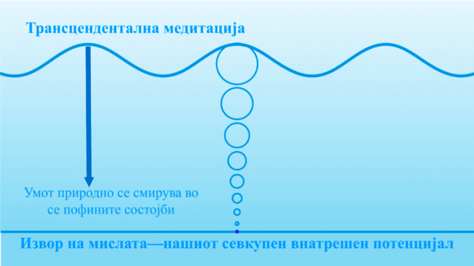 Длабоко во секој човек постои ниво на умот што е веќе мирно, стабилно и широко разбудено. Тој мир е секогаш присутен – денес, вчера, утре – но ние сме го изгубиле пристапот до него. Наместо тоа, сме заглавени на површината на умот, во немирот на секојдневните мисли. Трансценденталната медитација е едноставна, природна и ненапорна техника што му овозможува на активниот мислечки ум да се смири, да искуси потивки слоеви на мислата и на крајот да допре до најдлабокото ниво – изворот на мислата, чистата свест што постои во секој човек.